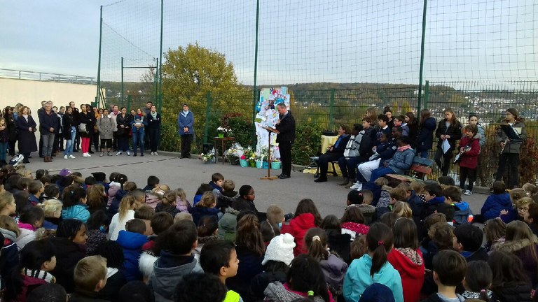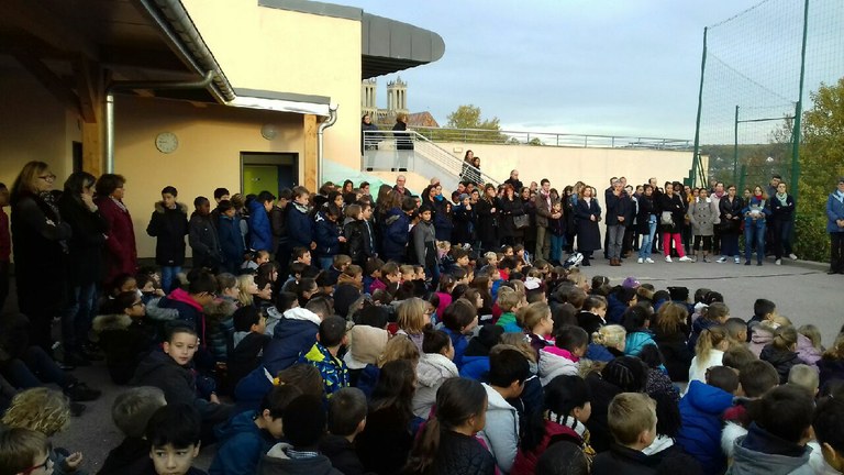 Marie Mudeli nous a quittés le 28 octobre dernier, en son souvenir, toute l'école était rassemblée dans la cour du haut en ce matin du 6 novembre pour un dernier hommage.