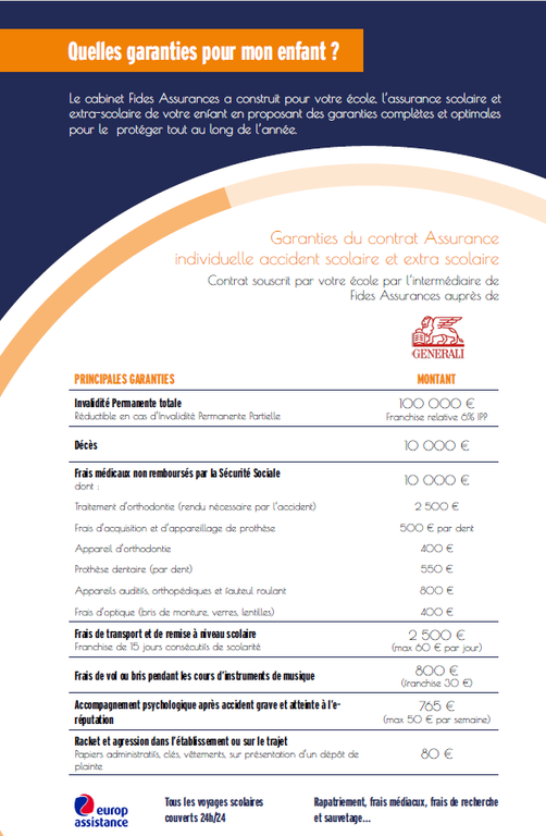 L'établissement souscrit une assurance pour tous les élèves inscrits à l'école. Elle est comprise dans notre forfait.