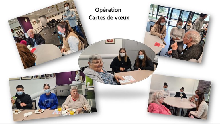Pour finir nous sommes retournés à l'EHPAD pour une deuxième rencontre. Nous leur avons offert les cartes de vœux et partagé un moment chaleureux en cette période de fêtes. Malheureusement toutes les cartes n'ont pas été remises en main propre car certains résidents étaient en isolement pour cause de covid et une résidente est décédée quelques jours plus tôt. Madame Da Silva et Madame Ouazir ont réalisé une carte de vœux pour les autres résidents de l’EHPAD qui n'ont pas pu participer au projet.