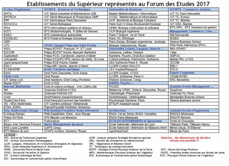 Liste des établissements présentés les années précédentes